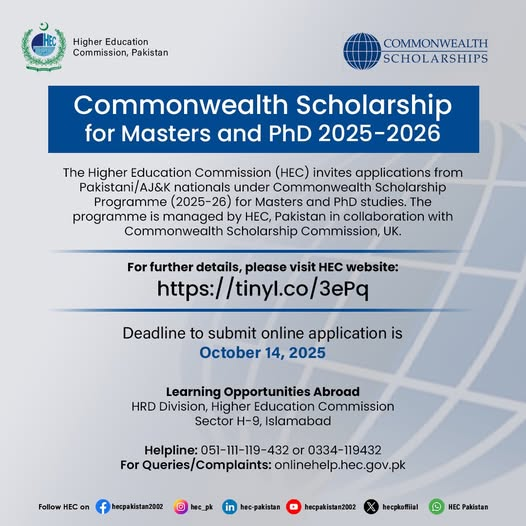 Applications for the Commonwealth Scholarship 2025–26…..کامن ویلتھ اسکالرشپ 2025–26 کے لیے درخواستوں کی وصولی کا آغاز