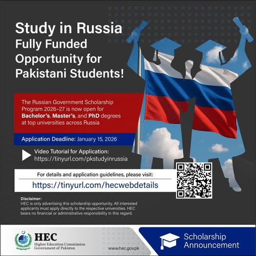 روسی حکومت کی طرف سےپاکستانی طلباء و طالبات کیلئے اسکالرشپ پروگرام 2026-27 کا اعلان