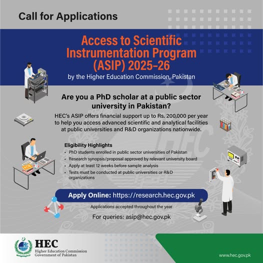 اسلام آباد: اعلیٰ تعلیمی کمیشن (HEC) نے سرکاری جامعات کے پی ایچ ڈی اسکالرز کو “ایکسس ٹو سائنٹیفک انسٹرومنٹیشن پروگرام (ASIP) 2025-26” کے لیے درخواستیں جمع کرانے کی دعوت دی ہے۔اس پروگرام کے تحت ملک بھر میں جدید سائنسی و تجزیاتی سہولیات تک رسائی کے لیے مالی معاونت فراہم کی جائے گی، تاکہ محققین اپنے تحقیقی منصوبوں کو عالمی معیار کے مطابق بہتر انداز میں مکمل کرسکیں۔ایچ ای سی کے مطابق، یہ اقدام پاکستانی جامعات میں سائنسی تحقیق کو فروغ دینے اور مقامی محققین کو جدید آلات اور وسائل سے استفادہ کرنے کا موقع فراہم کرنے کے لیے اٹھایا گیا ہے۔