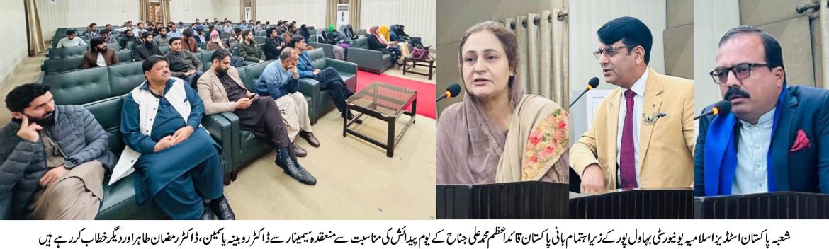شعبہ پاکستان اسٹڈیز نے شعبہ قانون اورآئی یو بی کشمیر اور نظریہ پاکستان سوسائٹی کے اشتراک سے اسلامیہ یونیورسٹی بہاولپور میں بانی پاکستان قائد اعظم محمد علی جناح کے یوم پیدائش کی مناسبت سے غلام محمد گھوٹوی ہال عباسیہ کیمپس میں سیمینار کا انعقاد کیا۔ وائس چانسلر پروفیسر ڈاکٹر محمد کامران نے اپنے پیغام میں قائد کے یوم ولادت کے موقع پر نوجوان نسل میں ان کی اقدار کو ابھارنے کی اہمیت پر زور دیا۔ انہوں نے کہا کہ قائداعظم کا وژن اور اصول ہماری رہنمائی کرتے ہیں کیونکہ ہم پاکستان کو ترقی اور ہم آہنگی کا مینار بنانے کی کوشش کر رہے ہیں۔ قائداعظم کے وژن، قیادت اور پاکستان کی تخلیق میں شراکت کے اعزاز میں منعقد ہونے والی اس تقریب میں کلیدی مقررین ڈاکٹر روبینہ یاسمین اور ڈاکٹر رمضان طاہر نے شرکت کی جنہوں نے جناح کی زندگی، اقدار اور نظریے پر روشنی ڈالی۔چیئرپرسن شعبہ پاکستان اسٹڈیز ڈاکٹر روبینہ یاسمین نے جمہوریت، مساوات اور انصاف کے لیے قائد کے غیر متزلزل عزم پر زور دیتے ہوئے طلباء پر زور دیا کہ وہ خوشحال اور متحد پاکستان کی تعمیر کے لیے ان کے اصولوں پر عمل کریں۔ ایڈوائزر آئی یوبی کشمیر اینڈ نظریہ پاکستان سوسائٹی ڈاکٹر رمضان طاہر نے تحریک پاکستان کی رہنمائی میں قائد کے کردار اور ایک پرامن، ترقی پسند اور جامع قوم کے لیے ان کے وژن پر روشنی ڈالی۔نظامت کے فرائض آصف عثمان نے سر انجام دیئے۔ تقریب میں ڈاکٹر فیاض انور، ڈاکٹر سعید احمد، ڈاکٹر محمد اکرام اللہ خان، ڈاکٹر محمد راشد، فیکلٹی ممبران، طلباء وطالبات نے شرکت کی۔