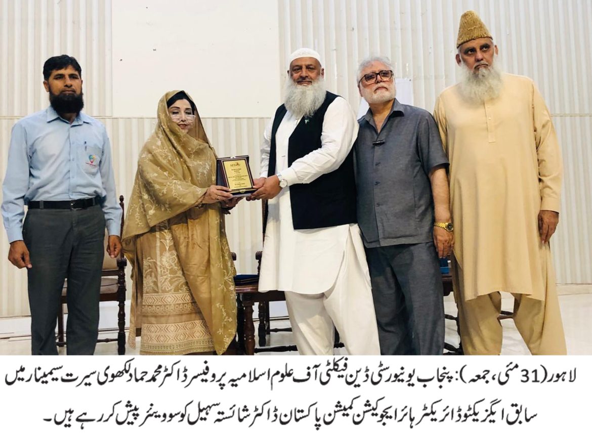 پنجاب یونیورسٹی فیکلٹی آف علوم اسلامیہ، ادارہ علوم اسلامیہ، سیرت چیئر اور ایس او ایس فاؤنڈیشن کے زیر اہتمام تعلیم و تربیت کا نبویﷺ اسوہ اور مُعاصر جدید ادارے‘ کے موضوع پر سیمینار کا انعقاد کیا گیا۔ اس موقع پر ڈین فیکلٹی آف علومِ اسلامیہ پروفیسر ڈاکٹر محمد حماد لکھو ی، فورم فار انٹرنیشنل ریلیشنز ڈیویلپمنٹ برطانیہ کے بانی چیئرمین طہٰ قریشی، پروفیسر سیرت چیئر ڈاکٹر عاصم نعیم، سابق ایگزیکٹو ڈائریکٹر ہائر ایجوکیشن کمیشن پاکستان ڈاکٹر شائستہ سہیل، پروفیسر ڈاکٹر حامد اشرف ہمدانی، فیکلٹی ممبران اور طلباؤطالبات نے شرکت کی۔ اپنے خطاب میں پروفیسر ڈاکٹر محمود حماد لکھوی نے موضوع کی اہمیت کو اجاگر کرتے ہوئے کہا کہ نبی کریم ﷺ کی زندگی ہمارے لئے مشعل راہ ہے۔ انہوں نے کہا کہ بطور مسلمان آپﷺ کی تعلیمات پر عمل پیرا ہوکر ہی دنیا و آخرت میں کامیابی مل سکتی ہے۔پروفیسر ڈاکٹر عاصم نعیم نے کہا کہ جدیدیت، عالمگیریت اور عالمی تبدیلیوں کے باعث اعلیٰ تعلیم فراہم کرنے والے ادارے بھی متاثر ہوئے ہیں۔ انہوں نے کہا کہ تعلیمی مقاصد ونظریات کی تشکیل سے لے کر نصابات و طریقہ ہائے تعلیم و تدریس کو متعدد نئے اور سنگین قسم کے چیلنجز درپیش ہیں۔ ڈاکٹر شائستہ سہیل نے ا یس او ایس فاؤنڈیشن کاتعارف اوراغراض و مقاصد پر روشنی ڈالی۔ انہوں نے کہا کہ اللہ تعالیٰ نے خودنبی کریم ﷺ کو امت کے لیے بہترین نمونہ اور اسوہ حسنہ قرار دیا ہے۔ ڈاکٹر حامد اشرف ہمدانی نے سیرتِ طیبہ ﷺمیں تعلیم و تدریس کی حیثیت و اہمیت پر آیات و احادیث پیش کیں۔ انہوں نے کہا کہ رسول کریم ﷺ کی تعلیم و تربیت ہر دور کے لئے مشعلِ راہ ہے۔طہٰ قریشی نے نبی کریمﷺکی تعلیمی پالیسی کے مختلف پہلوؤں پر سیر حاصل بات چیت کی۔ انہوں نے تعلیم و تربیت کے نظام میں وقت کے بدلتے تقاضوں کے ساتھ اصلاحات کی ضرورت پر زوردیا۔سیمینار میں نصاب تعلیم کی تبدیلی، تربیت یافتہ اساتذہ کا انتخاب، تعلیمی ضروریات پرنظرثانی،نبی کریمﷺ کی سیرت طیبہ کو تمام تعلیمی مدارج میں شاملِ نصاب کرنے، جامعات میں سیرت چیئرزکے قیام و تحقیق کے فروغ اور جامعات میں نبی کریم ﷺبحثیت معلم کو بطور مضمون شامل کرنے کی سفارشات پیش کی گئیں۔