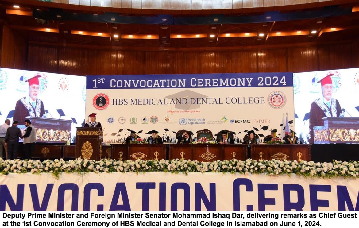 ایچ بی ایس میڈیکل اینڈ ڈینٹل کالج کے کانووکیشن کی تقریب سے خطاب کرتے ہوئے نائب وزیر اعظم نے کہا کہ صحت کی دیکھ بھال کے شعبے میں پیشہ ور افراد کو مستحق اور نادار افراد کی ضروریات کو اولین ترجیح دینی چاہیے اور اسلام کی بتائی گئی دوسروں کی بہتری کی کوششوں کے اعلیٰ اقدار کو فراموش نہیں کرنا چاہیے جس میں صحت کے شعبے میں کام کرنے پر زور دیا گیا ہے۔
