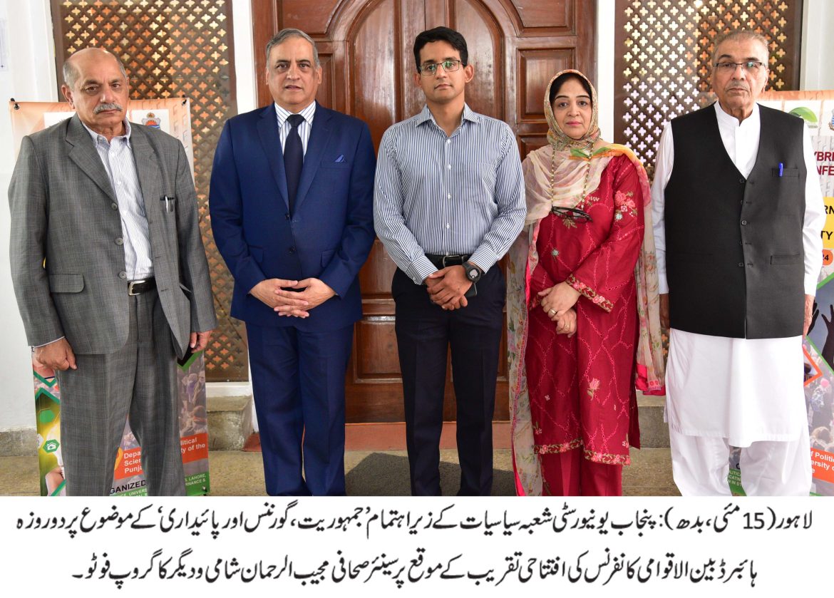 :پنجاب یونیورسٹی شعبہ سیاسیات کے زیر اہتمام ”جمہوریت، گورننس اور پائیداری“کے موضوع پر دو روزہ ہائبرڈ بین الاقوامی کانفرنس کی افتتاحی تقریب کا انعقادالرازی ہال میں کیا گیا۔ اس موقع پر سینئر صحافی مجیب الرحمان شامی،و ائس چانسلر منہاج یونیورسٹی لاہورڈاکٹر ساجد محمود شہزاد، ایگزیکٹو ڈائریکٹر پاکستان ریسرچ سینٹر فار اے کمیونٹی ود شیئرڈ فیوچر خالد تیمور اکرم، چیئرپرسن شعبہ سیاسیات پروفیسر ڈاکٹر ارم خالد، فیکلٹی ممبران، محققین اور طلباؤطالبات نے شرکت کی۔ کانفرنس میں مقررین نے جمہوری طرز عمل اور حکمرانی کے خیال سیر حاصل بات چیت کی۔مقررین نے اس بات کو اجاگر کیا کہ نہ صرف مشرق بلکہ مغرب میں بھی جمہوری اصولوں پر نظر ثانی کی جارہی ہے۔ کانفرنس کے سیشنز میں ٹیکنالوجی اور مصنوعی ذہانت کے استعمال اور جدیددور میں انفارمیشن مینجمنٹ کے استعمال پر روشنی ڈالی گئی۔ اپنے خطاب میں پروفیسرڈاکٹر ارم خالد نے بہترین کانفرنس کے انعقاد پر پروفیسر ڈاکٹر ریحانہ سعید ہاشمی اور ان کی ٹیم کی کاوشوں کو سراہا۔ انہوں نے کہا کہ کانفرنس میں 90 سے زائد قومی اور بین الاقوامی تحقیقی مقالے پیش کئے جارہے ہیں جس میں مصنوعی ذہانت کے ذریعے پائیدار ترقی سے لے کر پاکستان اور دنیا میں جمہوری ادارہ جاتی نظام کو برقرار رکھنے میں اداروں اور تنظیموں کے کردار تک کے مختلف موضوعات شامل ہیں۔