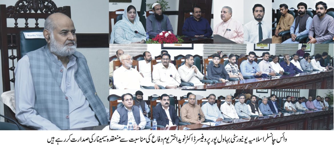 یوم دفاع کی مناسبت سے وائس چانسلر سیکریٹریٹ اسلامیہ یونیورسٹی بہاول پور میں خصوصی تقریب منعقد ہوئی۔ وائس چانسلر پروفیسر ڈاکٹر نوید اختر نے تقریب کی صدارت کی۔ اس موقع پر کیپٹن سہیل اکبر شہید کے والد اکبر بھٹی اور کیپٹن حسان عابد شہید کے والد ڈاکٹر محمد عابد مہمان خصوصی تھے۔ اس موقع پر پروفیسر ڈاکٹر محمد امجد ڈین فیکلٹی آف انجینئرنگ، پروفیسر ڈاکٹر ارشاد حسین ڈین فیکلٹی آف ایجوکیشن،پروفیسر ڈاکٹر نسرین اختر چیئرپرسن شعبہ سپیشل ایجوکیشن و ڈین فیکلٹی آف آن لائن اینڈ ڈیسٹنس ایجوکیشن،محمدشجی الرحمان رجسٹرار،ڈاکٹر مصور حسین بخاری چیئرمین شعبہ سیاسیات، پروفیسر ڈاکٹر آصف نوید رانجھا چیئرمین شعبہ سوشل ورک، ڈاکٹر شہباز علی خان چیئرمین شعبہ پبلک ایڈمنسٹریشن، ڈاکٹر محمد عدنان بخاری ایڈیشنل ڈائریکٹر اسٹوڈنٹس افیئرز،آصف ندیم ایڈوائزرآئی یو بی ڈیبیٹنگ سوسائٹی، ڈاکٹر شہزاد احمد خالد ڈائریکٹر میڈیا اینڈ پبلک ریلیشنز،ذوالفقار سعید ڈائریکٹر آئی ٹی، عبدالودود چیف سیکیورٹی آفیسر،رانا محمد اشرف ایڈیشنل کنٹرولر امتحانات،مزمل فیاض لیکچرار شعبہ انگریزی لسانیات، احمد بلال لودھی لیکچرار شعبہ پبلک ایڈمنسٹریشن،برکا خان لیکچرار شعبہ پبلک ایڈمنسٹریشن،منیب ملک المعروف بلڈرز، ندیم ورک، فیکلٹی ممبران اور افسران نے شرکت کی۔چیئرمین شعبہ سیاسیات پروفیسر ڈاکٹر مصور حسین بخاری نے خصوصی خطاب کیا۔ انہوں نیشہدا کے والدین اور ورثاء کو خراج تحسین پیش کیا۔انہوں نے کہا کہ 6 ستمبر یوم دفاع دھرتی پر مر مٹنے، ملک کی حفاظت کرنے کا دن ہے اور یہ دن دشمن کو پیغام دینے کا دن ہے کہ ارض پاک کی حفاظت ہمار ا ایمان اور ہماری ذمہ داری ہے۔ 1965کی جنگ پاکستان کی پہلی جنگ تھی جس میں پاک فوج کے جوانوں نے اپنی جان کا نذرانہ پیش کیا اور یہ سلسلہ ابھی تک جاری ہے۔انہوں نے کہا کہ دشمن کے خلاف ہماری فوج سیسہ پلائی دیوار کی مانند کھڑی ہوگئی اور انھیں شکست سے دوچار کیا۔پاکستان اس وقت بھی معاشی جنگ لڑ رہا ہے اور ہم سب کو ملکر پاکستان کو اس جنگ سے آزاد کروانا ہے۔تقریب کے آخر میں وائس چانسلر نے شہداکی فیملی کو طلبا کے بنائے ہوئے خطاطی کے نمونے پیش کیے۔