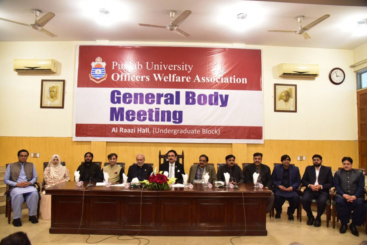 پنجاب یونیورسٹی آفیسرز ویلفیئر ایسوسی ایشن کی جنرل باڈی کا اجلاس الرازی ہال میں منعقد ہوا۔ اس موقع وائس چانسلر پنجاب یونیورسٹی پروفیسر ڈاکٹرمحمد علی، پرووائس چانسلر پروفیسر ڈاکٹر خالد محمود، رجسٹرار ڈاکٹر احمد اسلام، کنٹرولر امتحانات محمد رؤف نواز، خزانہ دار تسنیم کامران، اقامتی آفیسراول کرنل (ر) عمر خالد، صدر پنجاب یونیورسٹی آفیسر ویلفیئر ایسو سی ایشن ڈاکٹر توقیر علی، جنرل سیکرٹری رانا مظفر علی ودیگرافسران نے شرکت کی۔ اجلاس میں عمرہ کے مکمل پیکج کے لیے دوافسران زبیرنواز اعوان اورمحمد شاہد کے نام بذریعہ قرعہ اندازی نکالے گئے۔تقریب سے خطاب کرتے ہوئے وائس چانسلر پروفیسر ڈاکٹر محمد علی نے آفیسرز ویلفیئر ایسوسی ایشن کے اس اقدام کو سراہتے ہوئے امید ظاہر کی کہ افسران پنجاب یونیورسٹی کمیونٹی کی بہتری کیلئے اپنی ذمہ داریاں نبھاتے رہیں گے۔ ڈاکٹر توقیر علی نے عمرہ کے لیے نامزد ہونے والے خوش نصیب افسران کو مبارکباد پیش کی اوروائس چانسلرڈاکٹرمحمد علی کے تعاون پر شکریہ ادا کیا۔ انہوں نے یقین دلایا کہ آفیسر زویلفیئر ایسو سی ایشن پنجاب یونیورسٹی افسران کی بہتری کے لیے مثبت کردار ادا کرتی رہے گی۔ انہوں نے کہا کہ آئندہ برس چار افسران کو عمرہ کا ٹکٹ دینے کے لئے اقدامات کریں گے۔ بعد ازاں وائس چانسلر نے پنجاب یونیورسٹی کے ریٹائرڈ افسران کی خدمات کے اعتراف میں یادگاری شیلڈز پیش کیں